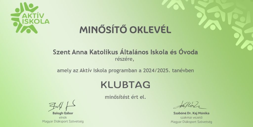 A szanyi Szent Anna Katolikus Általános Iskola és Óvoda Aktív Iskola munkaterve összhangban áll a mindennapos testnevelés, iskolai Pedagógiai Programban foglaltakkal.